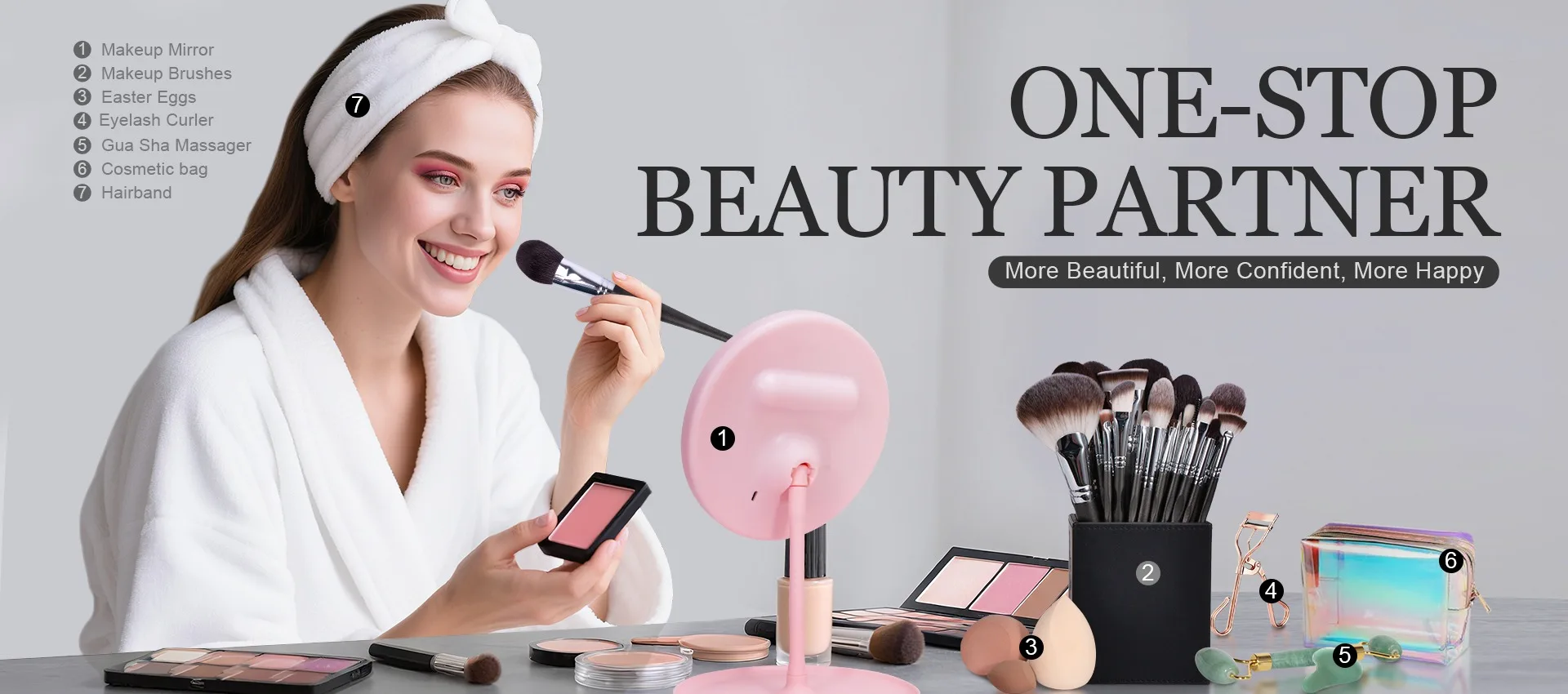 Principais produtos:Pincéis de maquiagem facial e corporal, faixa de cabelo facial SPA, toalha de envoltório de cabelo, máscara de dormir 3D, espelho de maquiagem